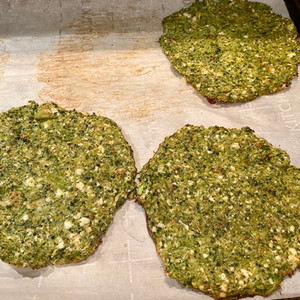 Process the broccoli and dump in a bowl, add grated cheese, eggs and seasonings. Mix together until well blended. Then using hands, scoop out palm size amounts and put on parchment paper. Press out into rounds and make them fairly thin.